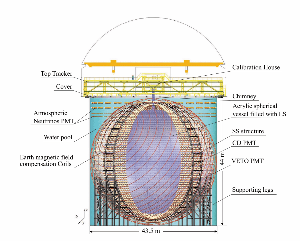 图1:JUNO探测器的示意图。球形中心探测器(CD)内置2万吨液体闪烁体,封装于有机玻璃球中,作为中微子靶。其外围环绕着充满超纯水的圆柱形水切伦科夫探测器。