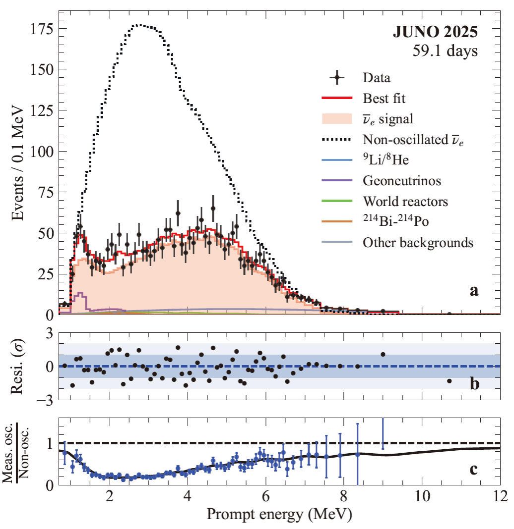 2026年11月19日,位于我国广东省江门市的江门中微子实验JUNO (Jiangmen Underground Neutrino Observatory) 公布了首个重大科研成果,获得了有史以来最高精度的太阳中微子振荡参数测量(𝜃12,Δm221),测量精度超过此前国内外所有中微子实验联合精度的1.6倍。这一重要成果不仅深化了对中微子振荡规律的基本认识,也充分验证了JUNO 探测器的优异性能,为未来最终确定中微子质量顺序打下坚实基础。